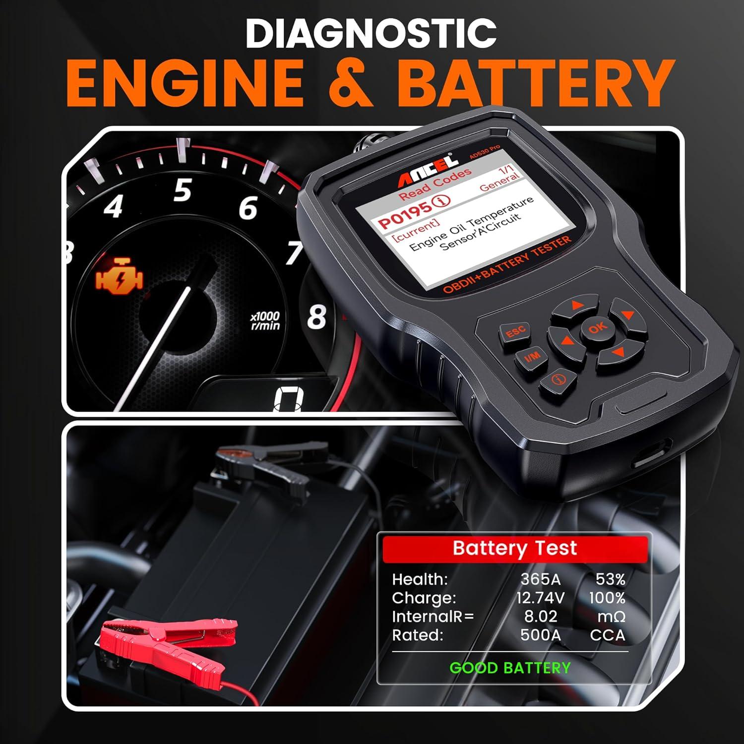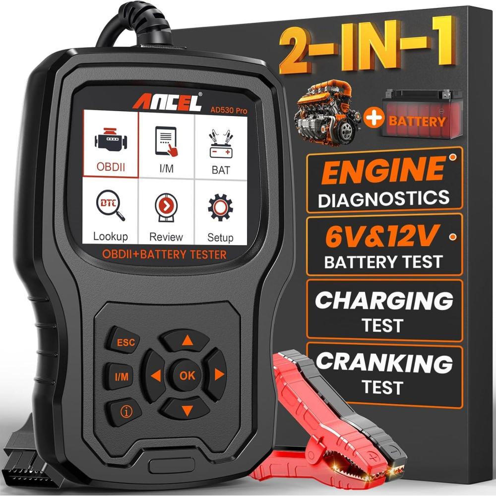 Upgraded 2 in 1 Check Engine & Battery: ANCEL AD530 PRO combines full-function OBD2 scanner with advanced battery tester (100-2000 CCA) in one compact tool—diagnosing engine lights and starting issues in seconds! Upgraded from the AD530, it adds cranking/charging tests for complete battery analysis. Featuring a 36% larger 2.8″ screen compared to standard 2.4″ screen, upgraded insulated clamps, and silicone protective case, it delivers pro-grade performance at half the cost of separate tools