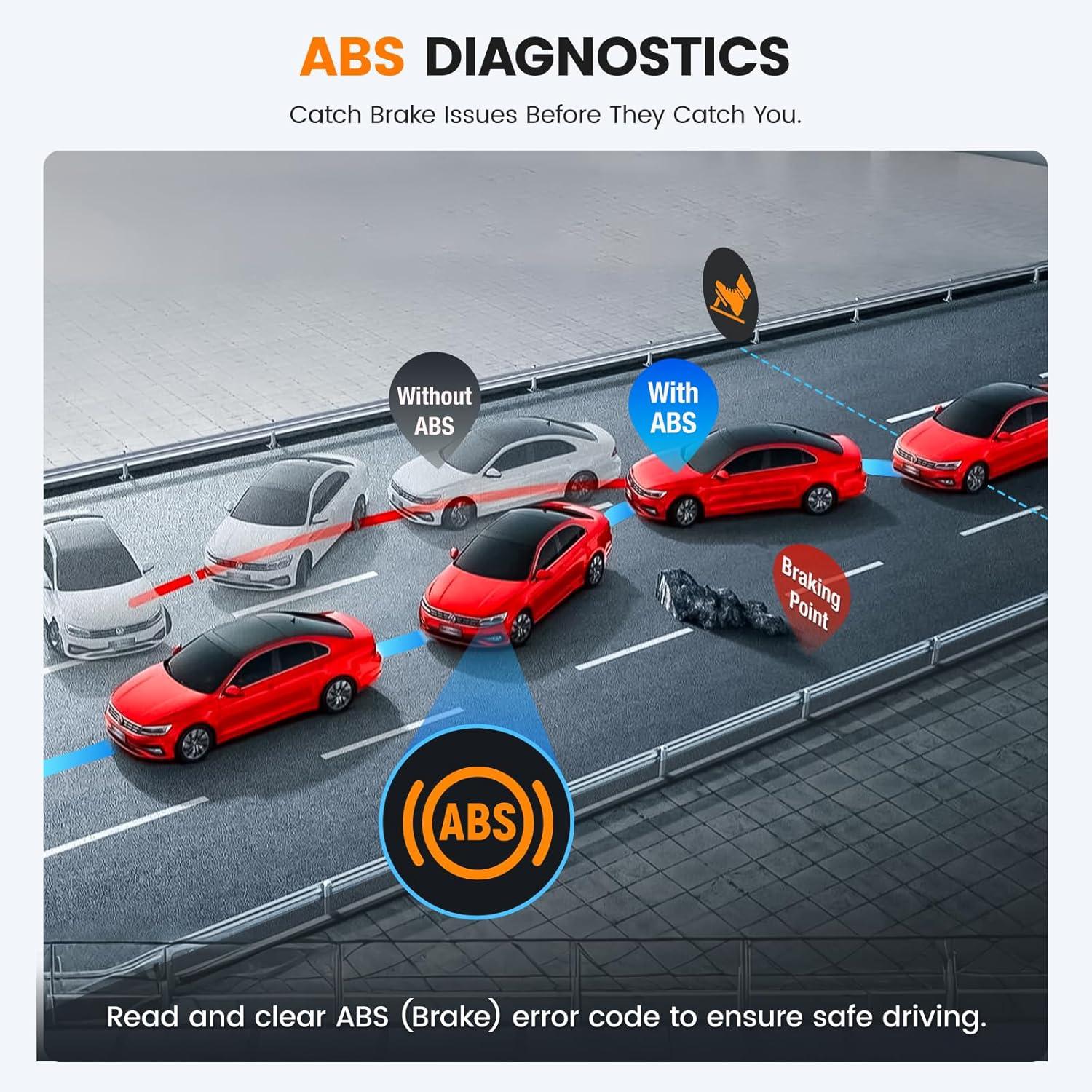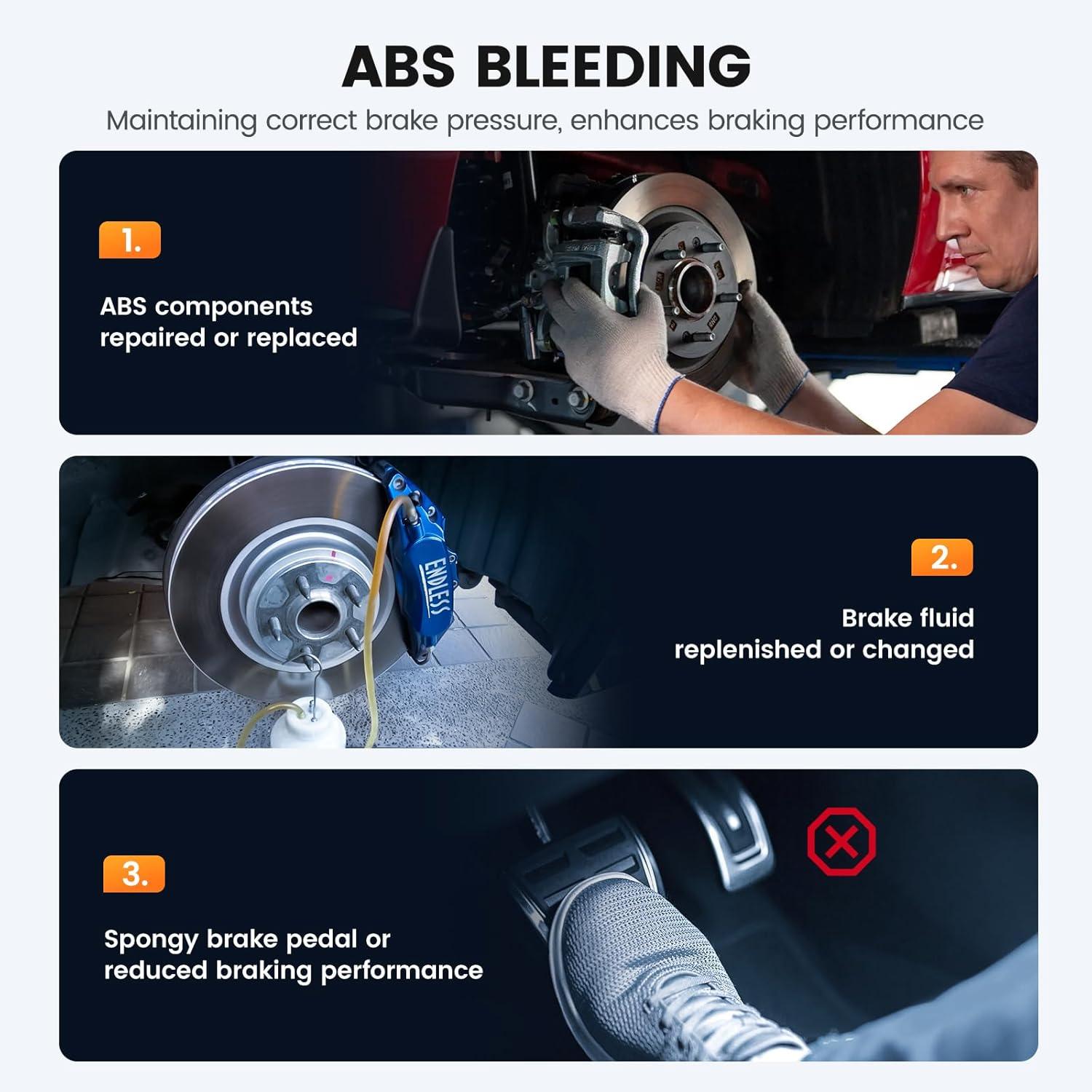 ABS Auto Bleeding – Helps bleed your vehicle's Anti-lock Braking System (ABS), removing air from the brake lines to ensure optimal brake performance. It helps prevent brake issues such as spongy pedals, inconsistent braking, and reduced stopping power, and enhances vehicle safety by ensuring the ABS system is working properly, especially during critical driving situations. NOTE: It’s not compatible with vehicles that only support manual bleeding
