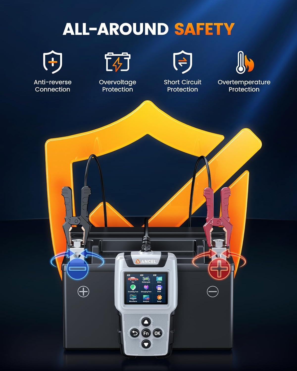 Safety Assurance: The battery tester is equipped with reverse polarity, short circuit, overcurrent, and overvoltage protection for worry-free testing. The durable ABS casing enhances impact and corrosion resistance, extending the lifespan of the device. High-quality copper clips with insulation ensure electrical safety, protecting both the vehicle battery and personal safety
