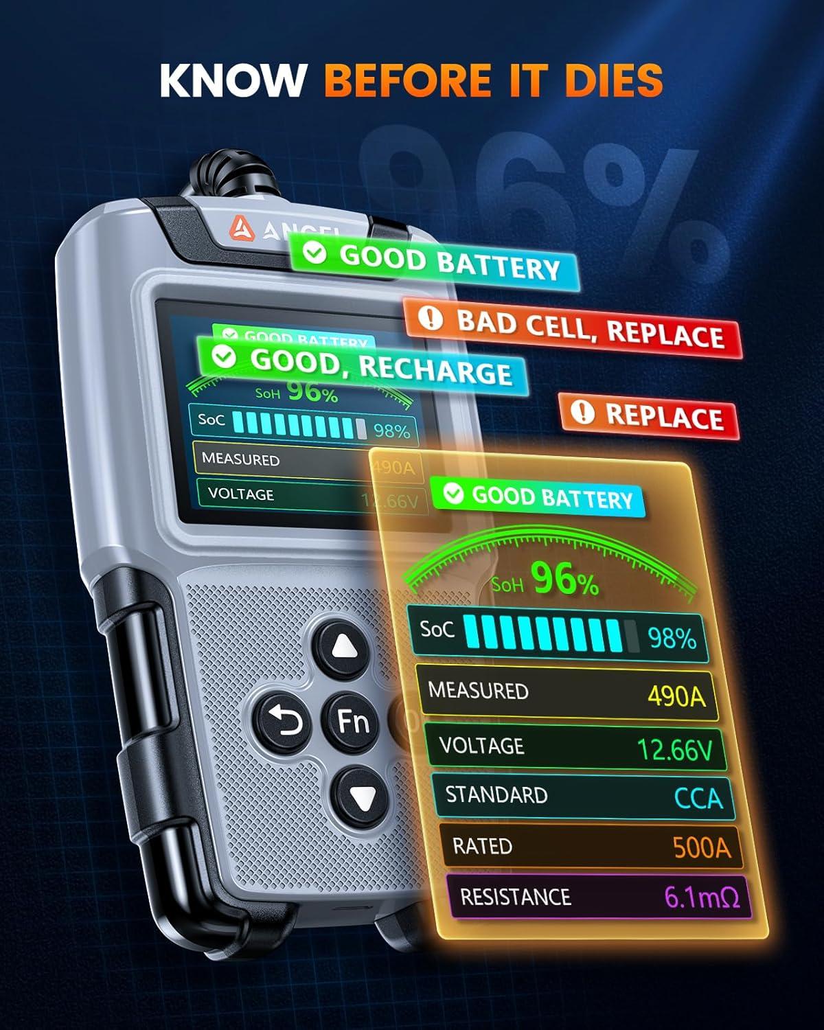 6V&12V Battery Tester: The upgraded ANCEL BA101 PLUS supports testing all 6V&12V 20-2000 CCA lead-acid batteries, including Regular Flooded, AGM Flat Plate, AGM Spiral, and Gel batteries. It can measure CCA, internal resistance, voltage, SoH (State of Health), and SoC (State of Charge)