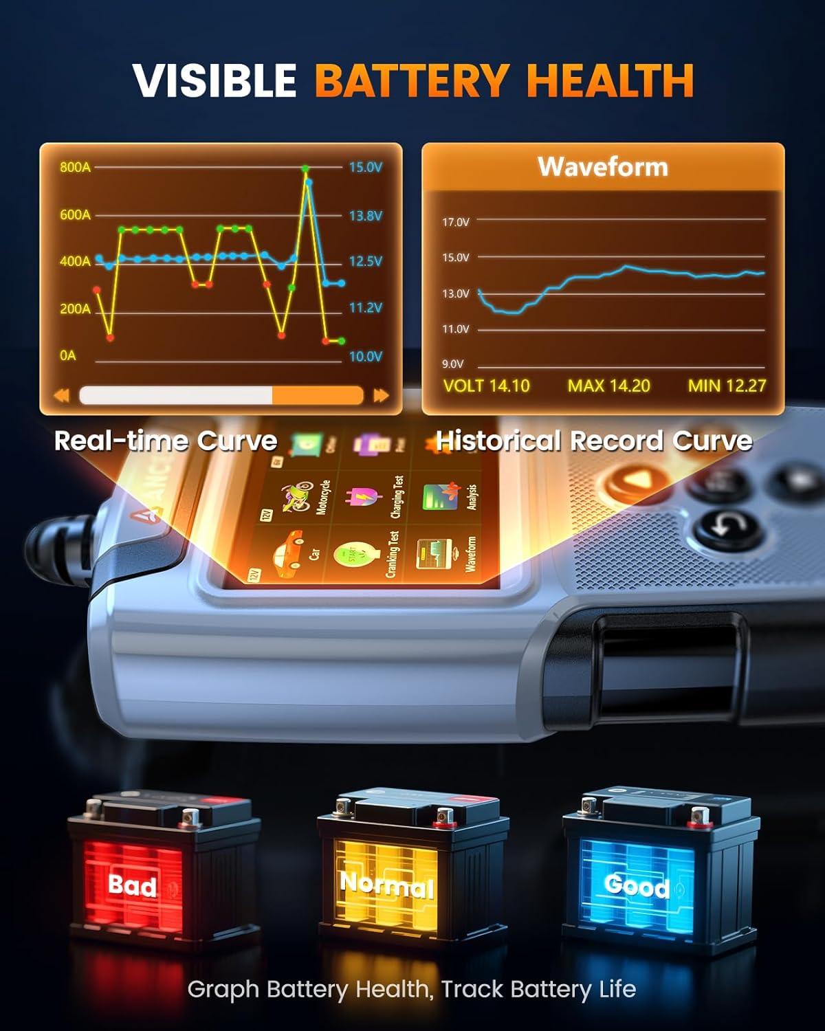 Real-time Voltage Display: BA101 PLUS features a graphical operating system with real-time voltage curve display, which can be saved for up to 120 seconds and replayed. It can store up to 1,400 historical test records, including 350 each for battery, crank, charging tests, and voltage curves, allowing you to review previous records and compare battery health over time