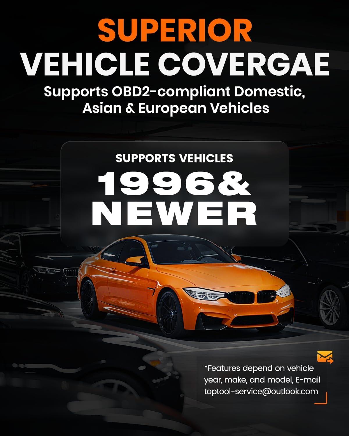 ALL 10 OBDII MODES – FULL COVERAGE, FULL CONTROL. Scan and clear engine fault codes, run EVAP and O₂ sensor tests, check I/M readiness, monitor live data, capture freeze-frame readings, and generate diagnostic reports in seconds. Covers all 10 OBDII/EOBD modes for complete diagnostics—ideal for spotting engine issues early and avoiding costly repairs. Note: ABS, SRS, and transmission codes cannot be cleared