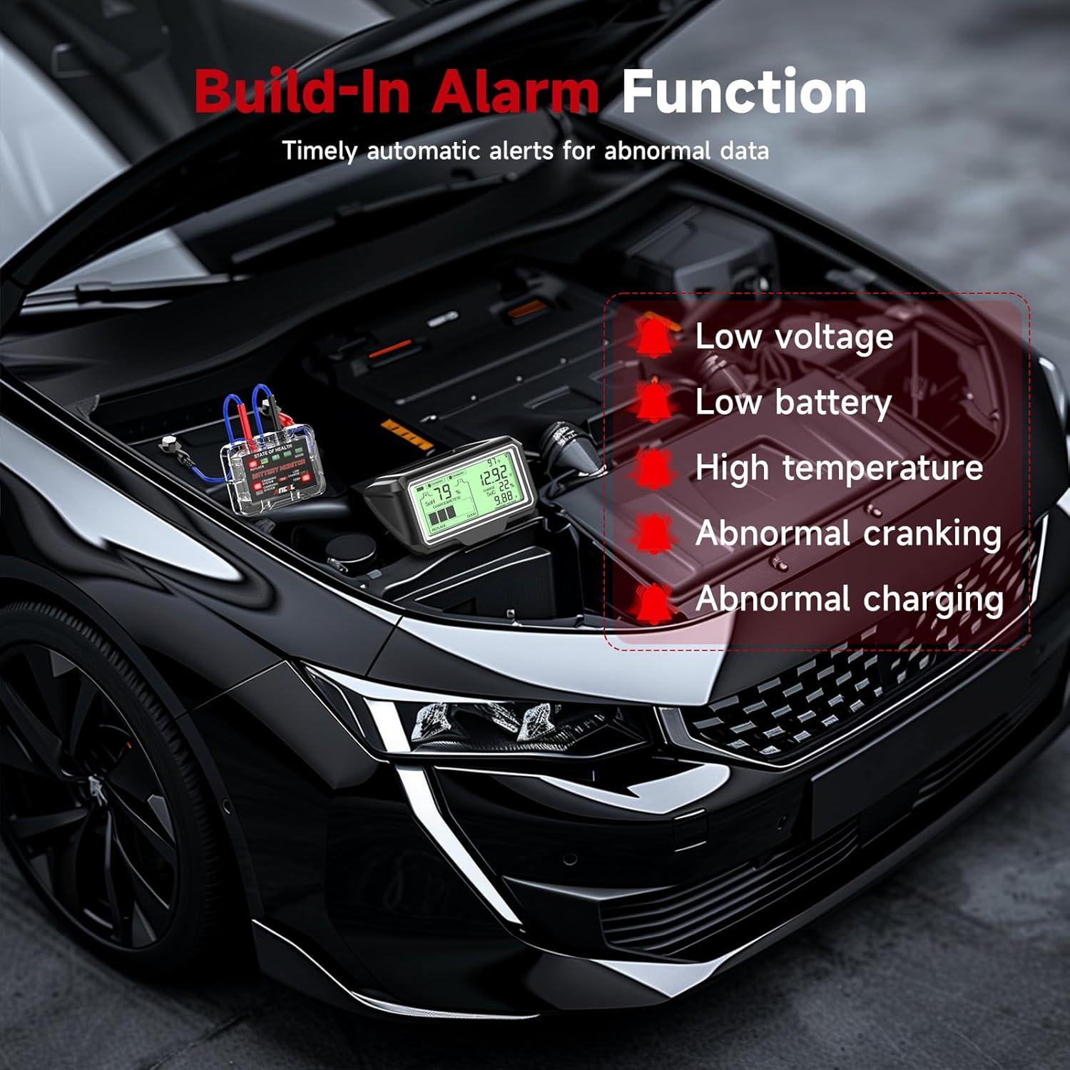 ✅Easy Operation And Battery Health Status Indicator: You only need to connect the negative (black) connector firmly to the negative battery port and the positive (red) connector firmly to the positive battery port. Place the LCD display in front of the windshield to view battery health data such as: voltage, power percentage, temperature, charging system test, starting system test, health percentage, etc. Battery status can also be displayed by the 9 LED light on top of the wireless host unit.