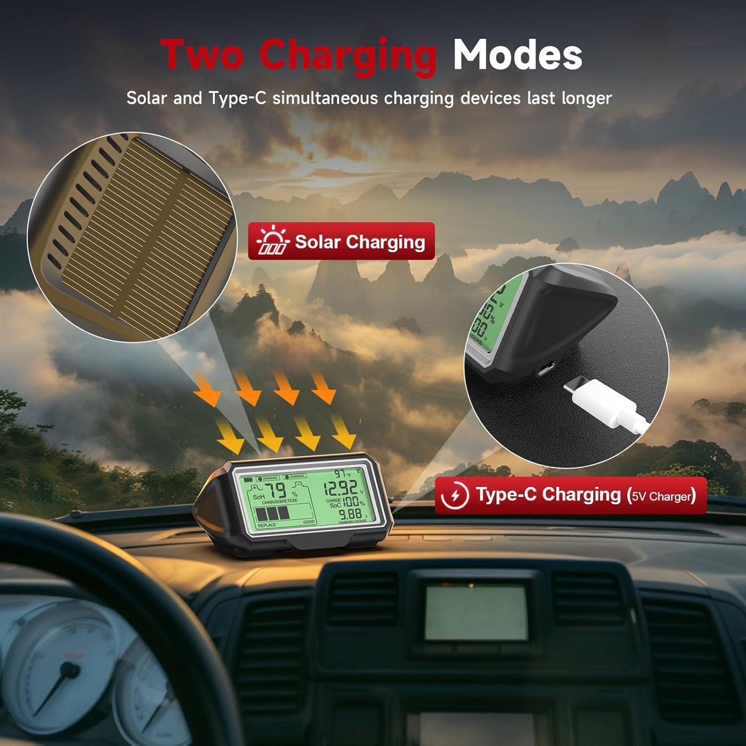 ✅Energy Saving And Environmental Protection: The car battery tester display screen adopts two modes of power supply:Type-C fast charging and solar panel. The solar panel powers and charges the device so that it does not need to be charged as often.The use of solar cells are more environmentally friendly, energy efficient, and can work independently of the grid.This is very useful for some remote areas or wilderness adventure and other scenarios.High economy can reduce energy costs.