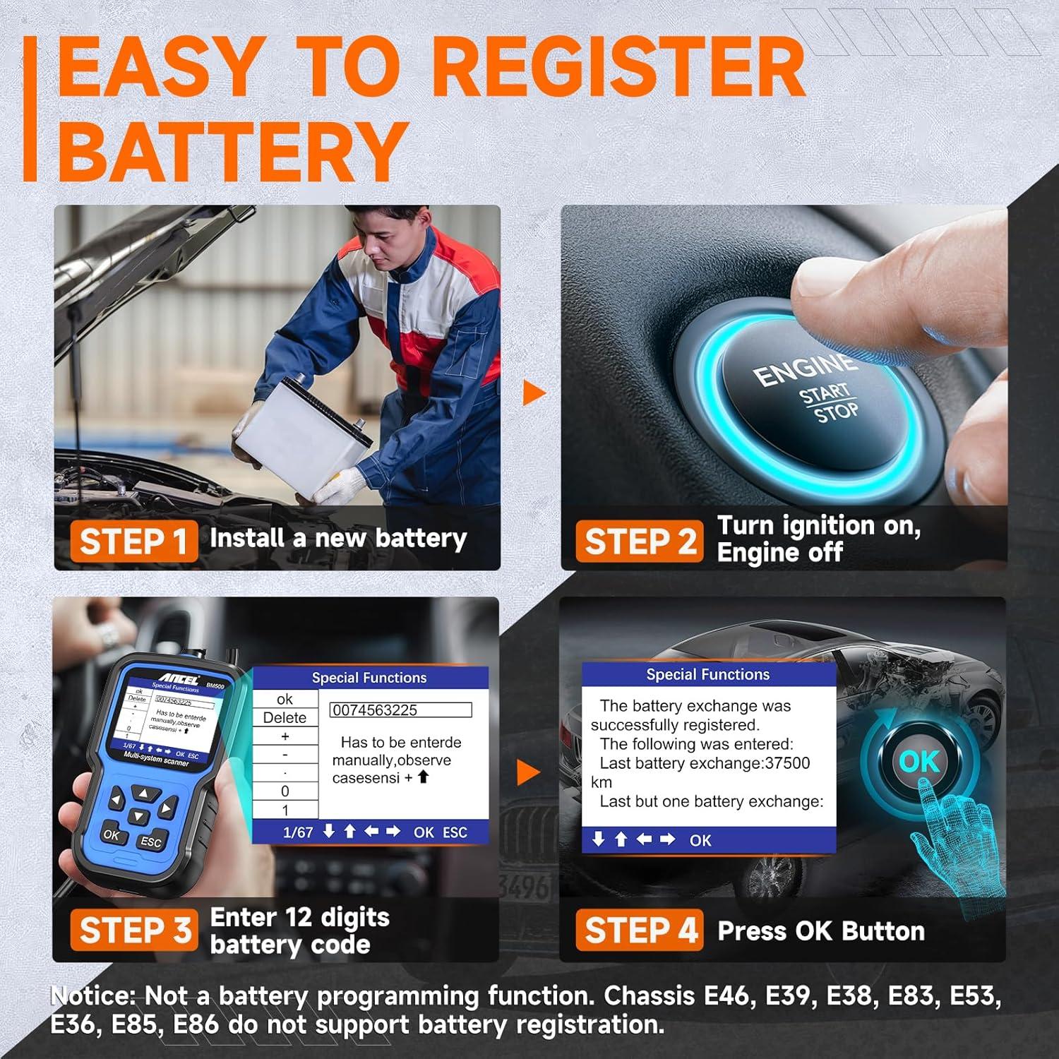 Battery Registration Guarantees Peak Power – Performing a battery reset fits for BMW is crucial when replacing a damaged or aging car battery with a new one. To register your battery, follow these steps: Turn the ignition on, keep the engine off, check the dashboard to ensure it is in diagnostic mode. It is advisable to choose a replacement aftermarket battery with the same specifications, including capacity and type, for optimal performance. Battery pro-gramming is not supported.