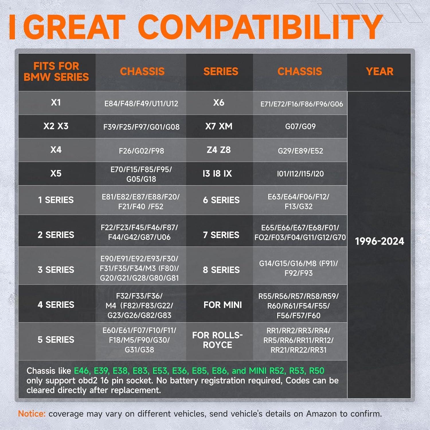 Powerful Compatibility Unleashed – It is highly compatible with BMW, MINI, and Rolls-Royce models after 1996, covering a wide range, including 1 Series E81/E82, 2 Series F22/F23, 3 Series E90/E93, 4 Series F32/F33, 5 Series E60/E61, 6 Series E65/E66, 7 Series E38/E65, 8 Series G14/G15. Guarantees seamless diagnostics and troubleshooting. Ideal for BMW enthusiasts and owners, it offers a versatile and user-friendly tool for efficient maintenance.