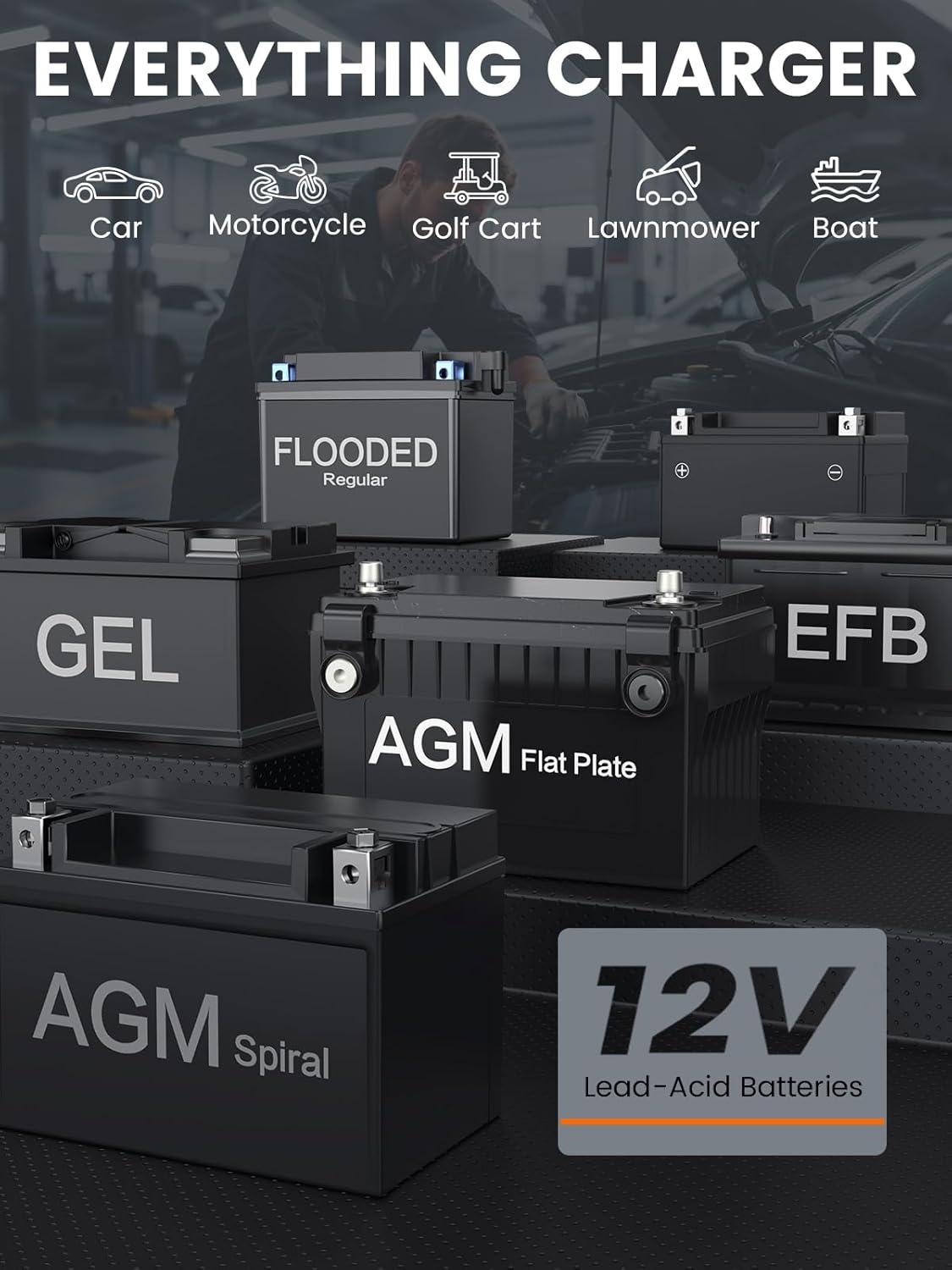 COMPATIBILITY: Designed for ALL 12V lead-acid batteries: AGM, GEL, SLA, Flooded, Deep Cycle, Marine and so on. Supports cars, motorcycles, boats, ATVs, SUVs, RVs, trailers, lawnmowers, mopeds, classic cars, and more. Whether you're testing or charging—it’s the one tool for every job