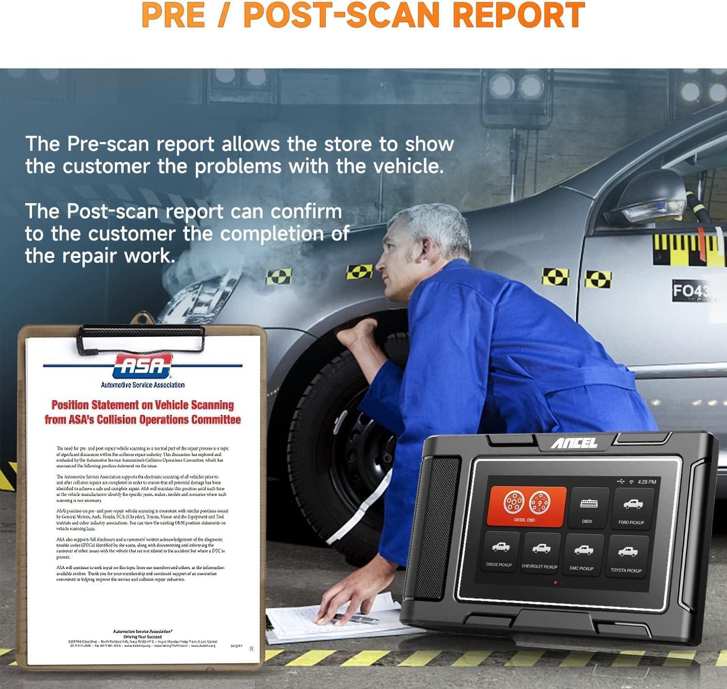 🚚【Unique Pre-scan & Post-scan Report】 A position statement about re- and post-repair system scanning, issued by the Automotive Service Association (ASA). You can save and Print Pre/Post-scan Report with HD3500 code reader for cars and trucks. The Pre-scan report allows the repair store to show the customer what problems exist with the vehicle. The Post Scan report allows confirmation to the customer of the completion of the repair work.