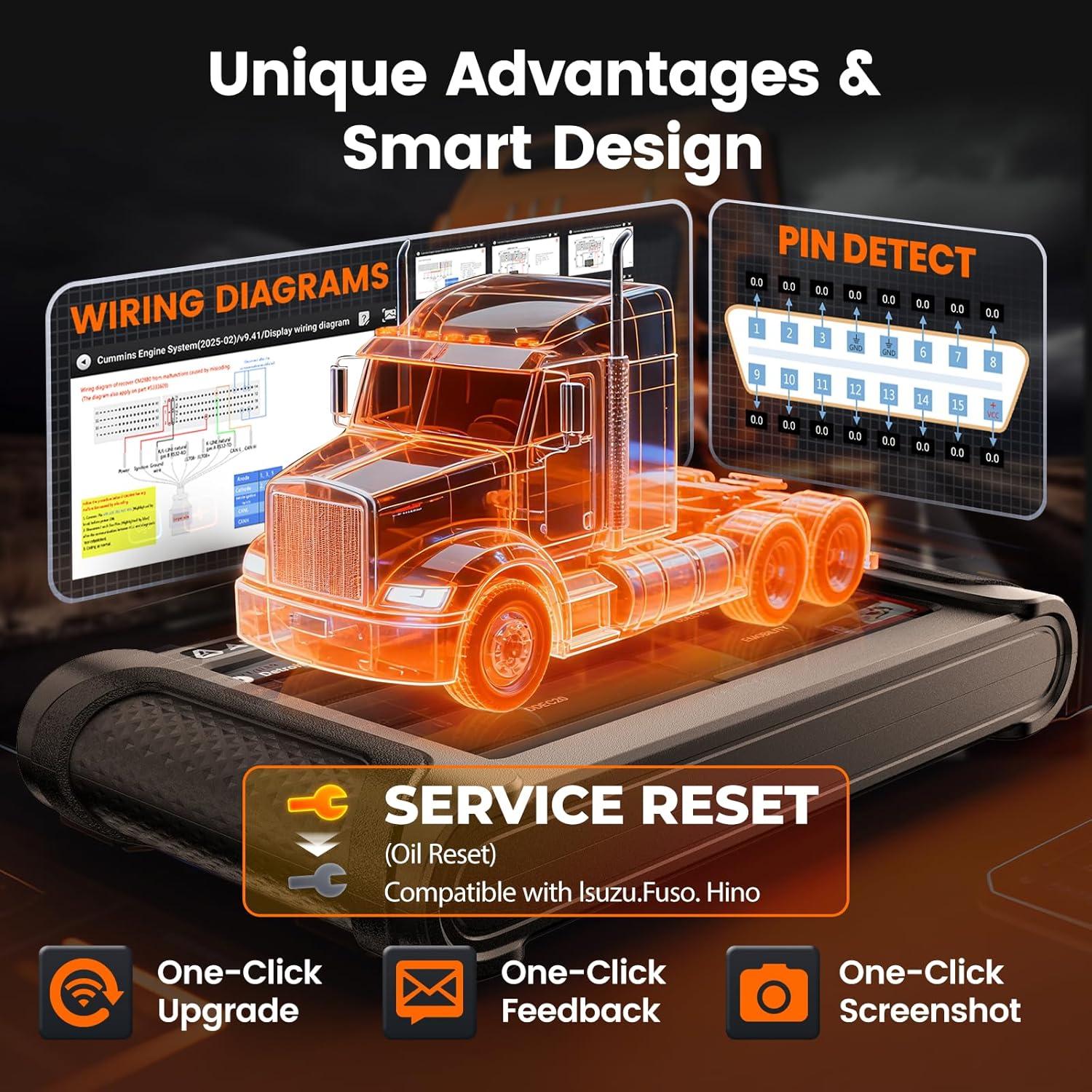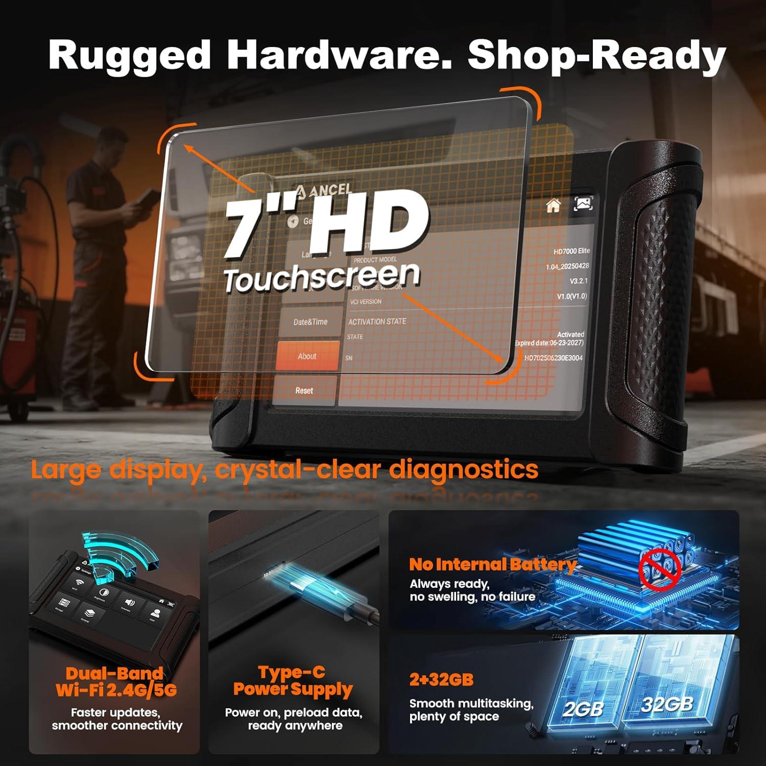 Diagnose Anywhere, Zero Signal Needed : Never lose diagnostic power in low-signal workshops. Download all data via Wi-Fi in your office, then perform wireless diagnostics anywhere with our 7″ HD touchscreen. Dual-band Wi-Fi (2.4G/5G) ensures fast downloads, while Type-C power lets you preload and go. The reliable battery-free design means it's always ready, and 2+32GB handles multiple trucks with ease