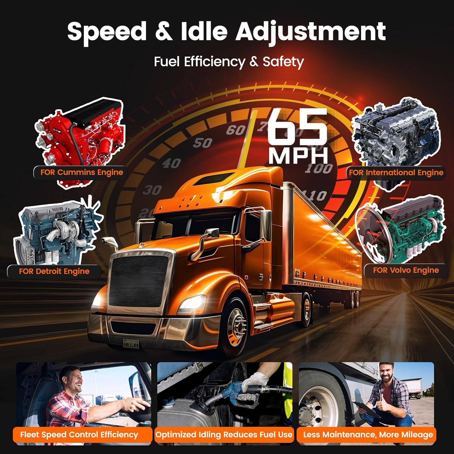 Idle & Speed Limit Adjustment For Detroit Cummins Intl Volvo : Long idling, inefficient idling, or unsuitable speed limits can waste fuel and wear down your engine over time. The truck scanner diagnostic tool lets you safely adjust and restore factory-approved idle and speed parameters right from your cab—no need for shop assistance. Fine-tune performance for different routes or job sites, improve fuel efficiency during downtime, and keep your truck running smooth, compliant, and ready for the next haul. Available in the “Diesel Engine” menu