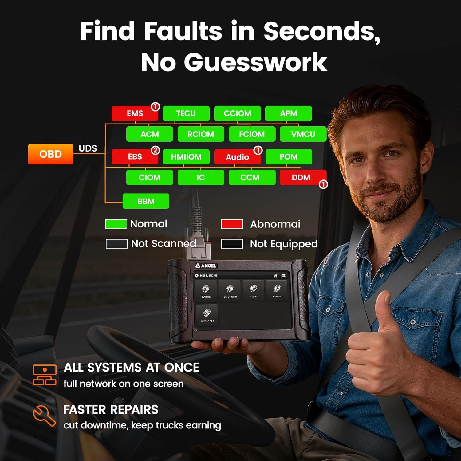 Full Commercial Vehicles Scan, Stop Problems Early : Every minute of downtime eats into your route and revenue. This professional-grade truck scanner delivers full-system coverage for Kenworth, Freightliner, Peterbilt, International, Volvo, Mack, Western Star and more. Instantly read engine, ABS, transmission, and body data to detect hidden faults before they become breakdowns. View live parameters, clear fault codes, and keep your fleet running smooth, compliant, and profitable. Smart diagnostics mean fewer surprises and more miles that pay. NOTE: Repair Before Clearing Codes