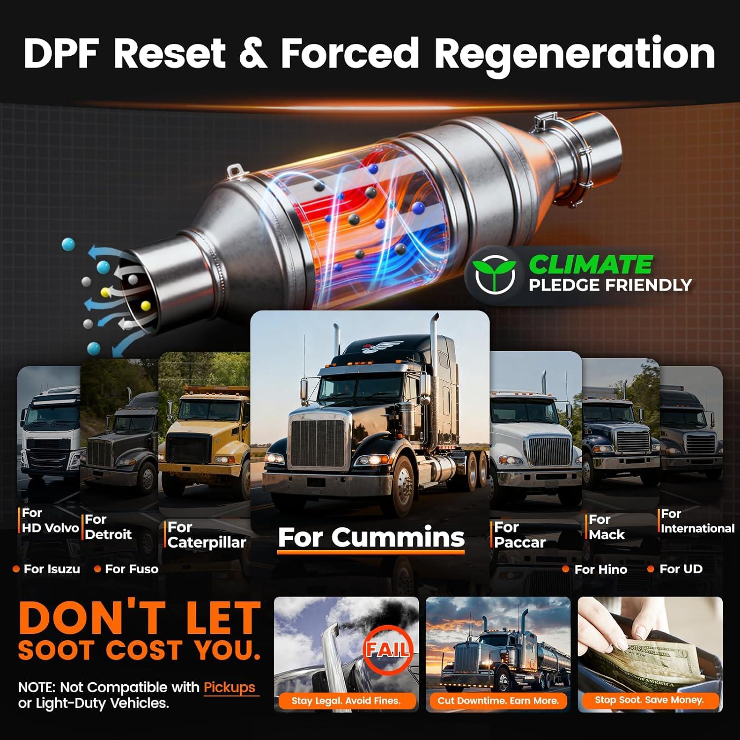 Heavy-Duty DPF Regen For Major Commercial Vehicles : Struggling uphill or losing power mid-route? Carbon buildup in your DPF can trigger derate mode and slow your truck to a crawl. With the ANCEL HD7000 Elite heavy duty truck scanner, perform parked DPF regen from the cab for most Cummins, Paccar, Caterpillar, Detroit, HD Volvo, Mack, International, Isuzu, Fuso, Hino, UD. Skip downtime, avoid DOT fines, and keep your truck running strong. NOTE: HD7000 Elite Not for pickups or light-duty vehicles