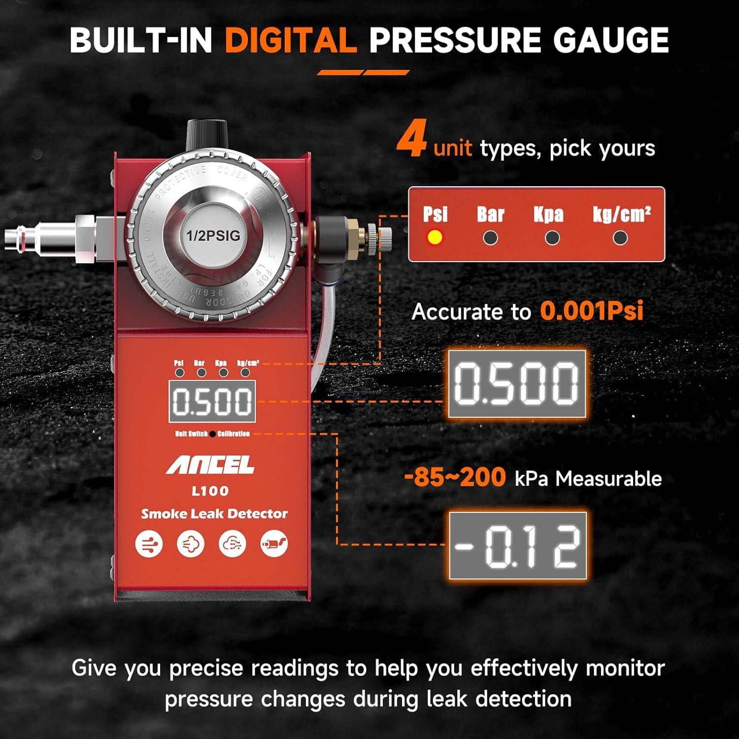 📊【Upgraded Digital Display for Precision】The ANCEL L100Pro Smoke Machine boasts an upgraded digital display, offering real-time, precise readings for accurate diagnostics. Unlike traditional gauges, the digital screen is clear and intuitive, removing the guesswork from your tests. Plus, it supports 4 units of measurement (PSI, kPa, bar, and kg/m²), making it adaptable to any application. This enhancement ensures greater accuracy, faster diagnostics, and less error