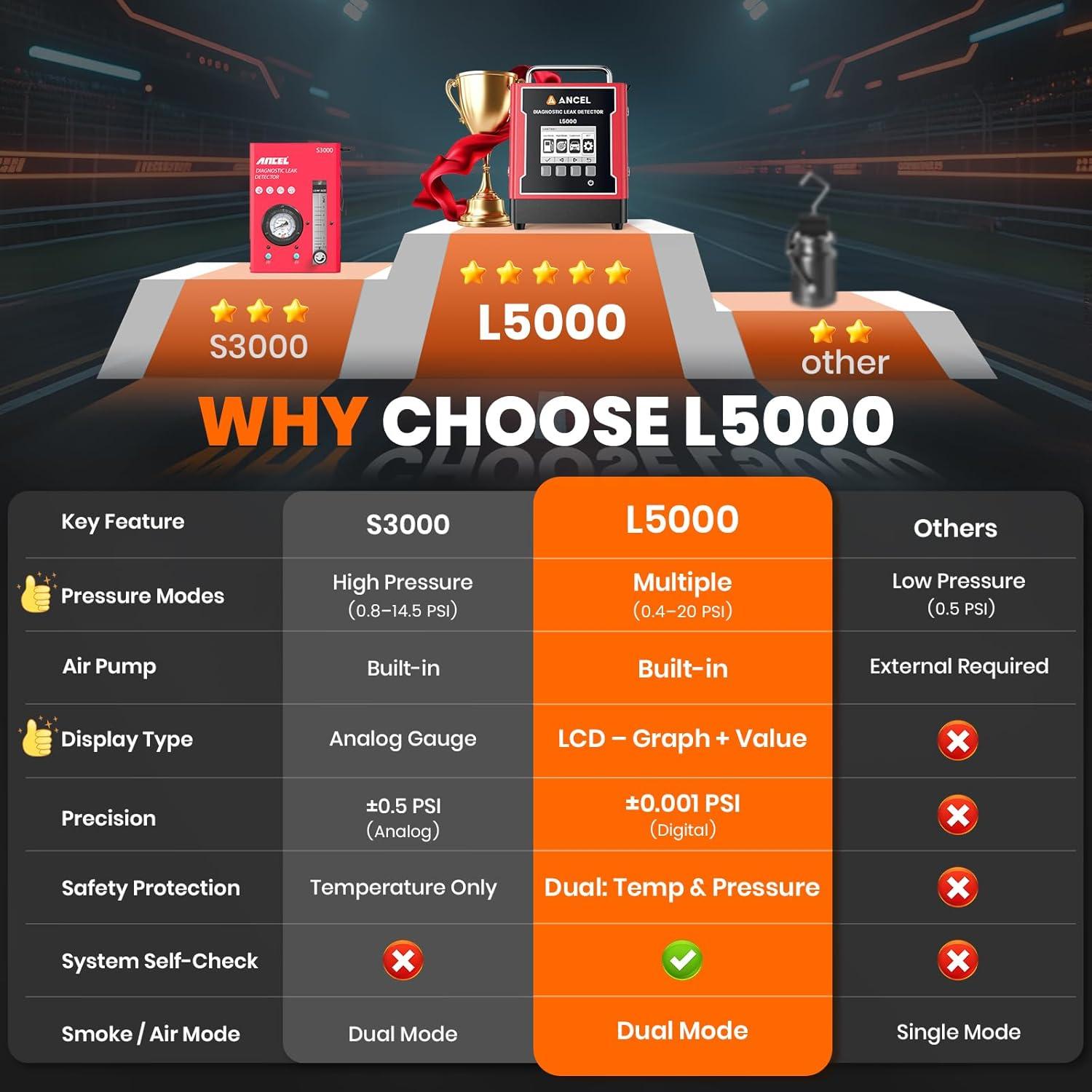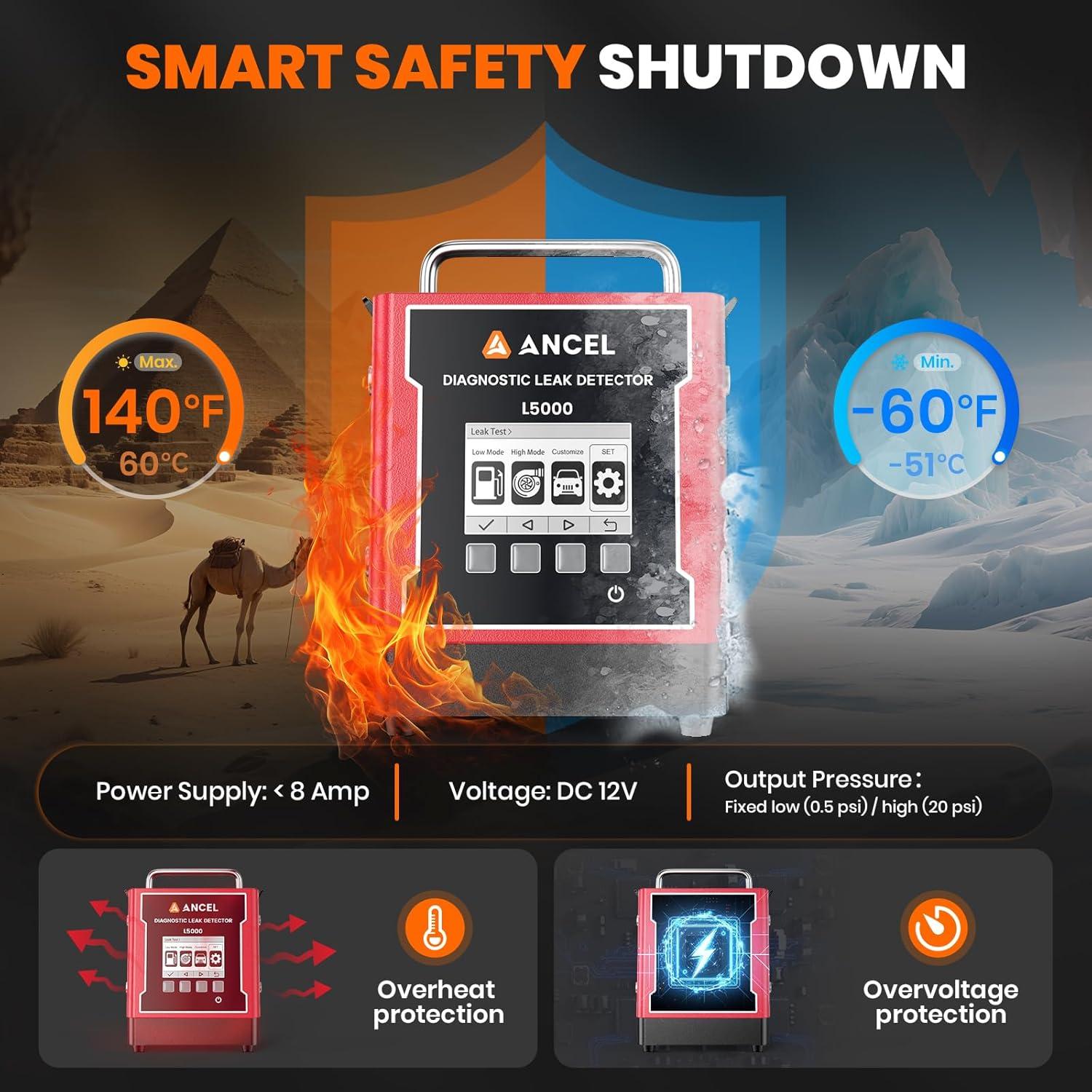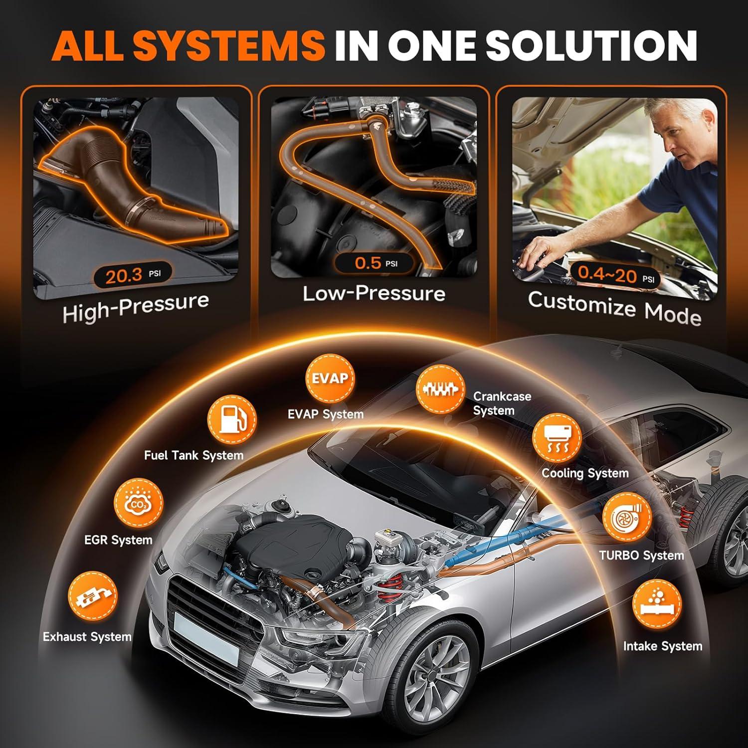 3 Modes, Detect Any Leak Like a Pro: Tackle any leak with ease! ANCEL L5000 smoke machine automotive offers Low (0.5 PSI), High (20.3 PSI), and Custom Pressure modes (0.4–20 PSI), perfect for diagnosing EVAP, turbo, fuel, EGR, crankcase, intake, exhaust, and cooling systems. From sunroofs and window seals to cabin leaks and tiny hose cracks, no suspicious leak goes unnoticed. Experience the confidence of accurate leak detection, so you can fix problems right the first time