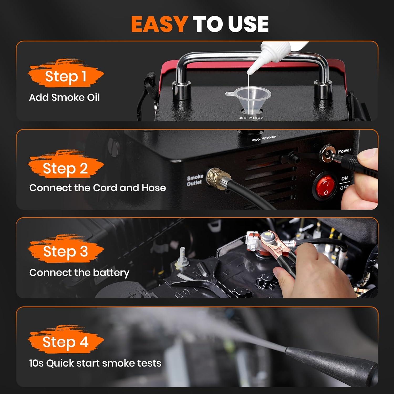 Easy 4-Step Operation: No steep learning curve here! Start leak testing in just four steps: 1) Add smoke oil (mineral or baby oil), 2) Connect hose, 3) Attach to 12V DC, 4) Begin testing. Whether you're a first-timer or a seasoned tech, the thick smoke makes pinpointing leaks quick and easy—even in tight spots (Note: Smoke oil is not included for transport safety.)