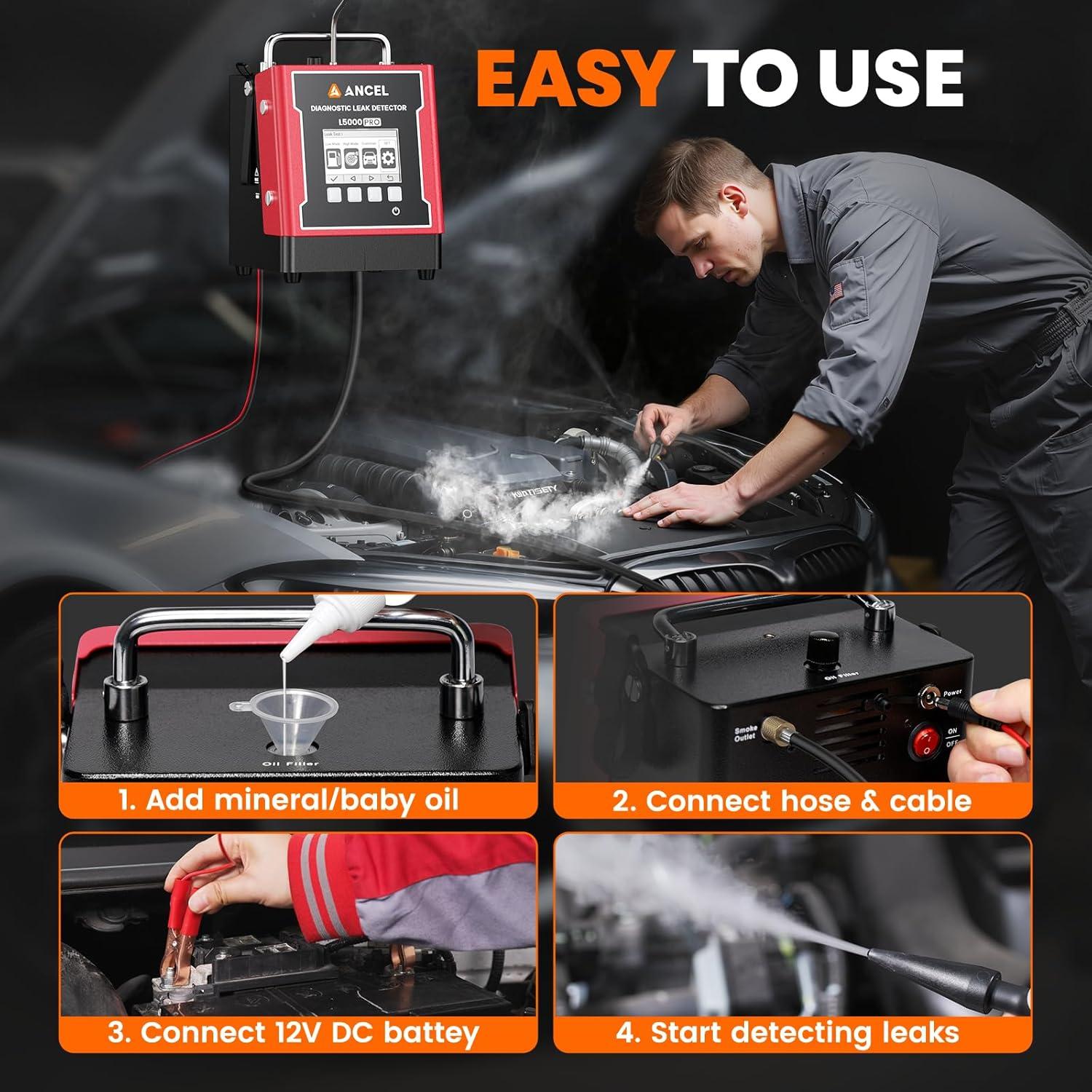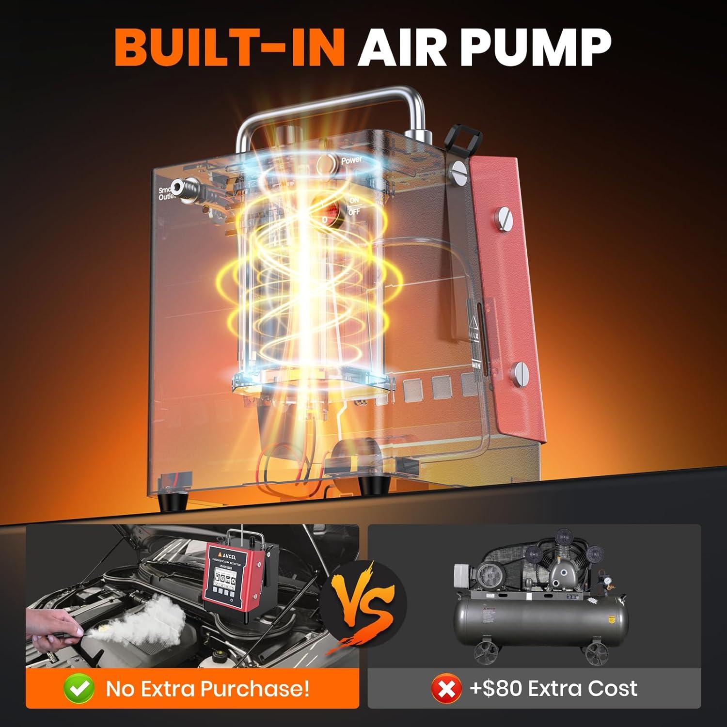 Built-In Pump, Fast Smoke in Seconds: No bulky compressor needed. The built-in pump delivers adjustable pressure up to 20.3 PSI and produces thick smoke in seconds, quickly filling the system so leaks become visible right away. EVAP smoke machine leak tester with compact enough for busy shops or mobile repairs, it cuts setup time and lets you spend less time preparing and more time actually fixing leaks
