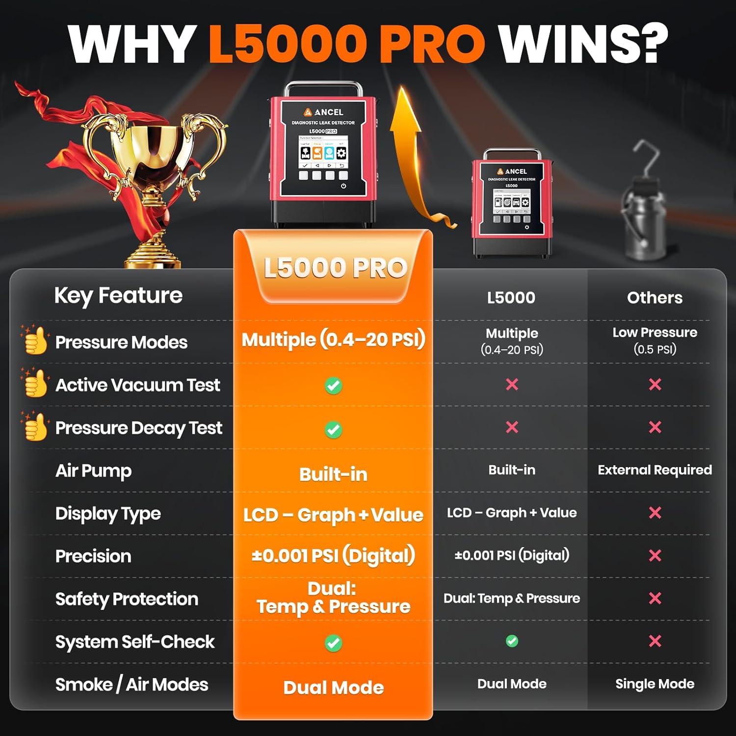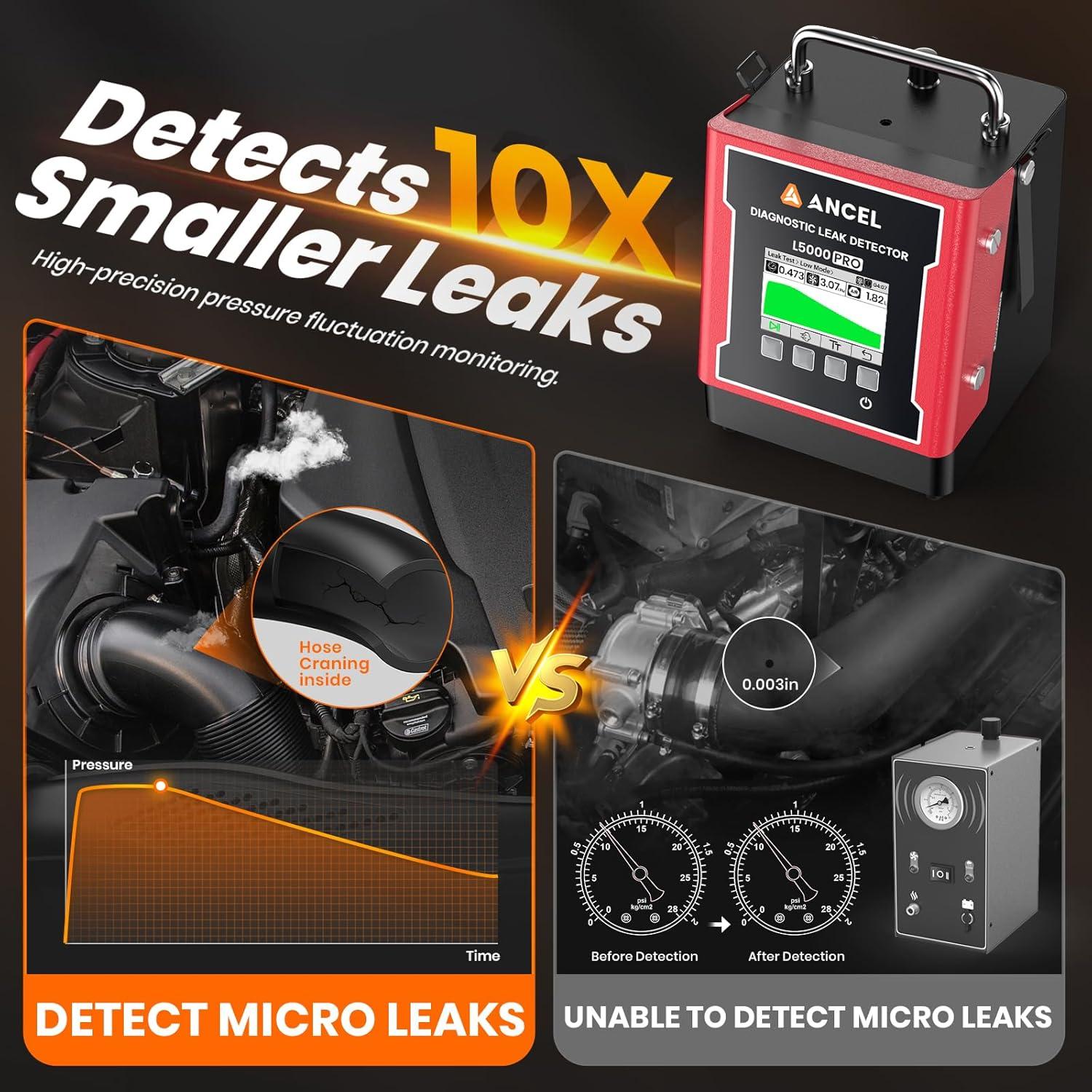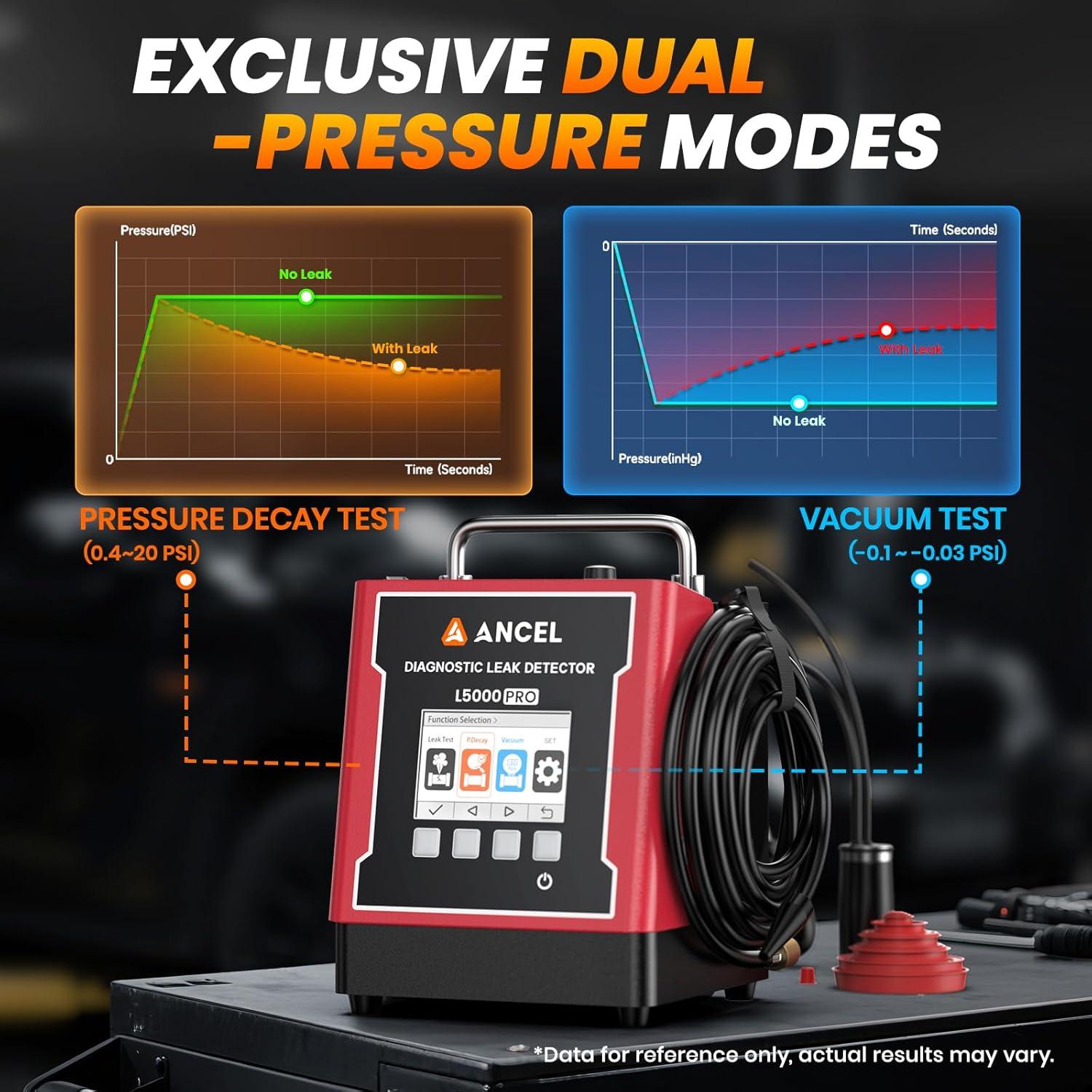 Why choose L5000 PRO? As ANCLE's most advanced automotive smoke machine leak detector, ANCEL L5000 PRO takes the leak detection to the next level. It combines pressure decay and vacuum testing in one unit, with an unmatched pressure output range from -0.1 to 20.3 PSI. It helps to restore the physical process of leakage occurrence, detect leakage faster and more safely, reduce expensive guesswork, and save time and money for each maintenance