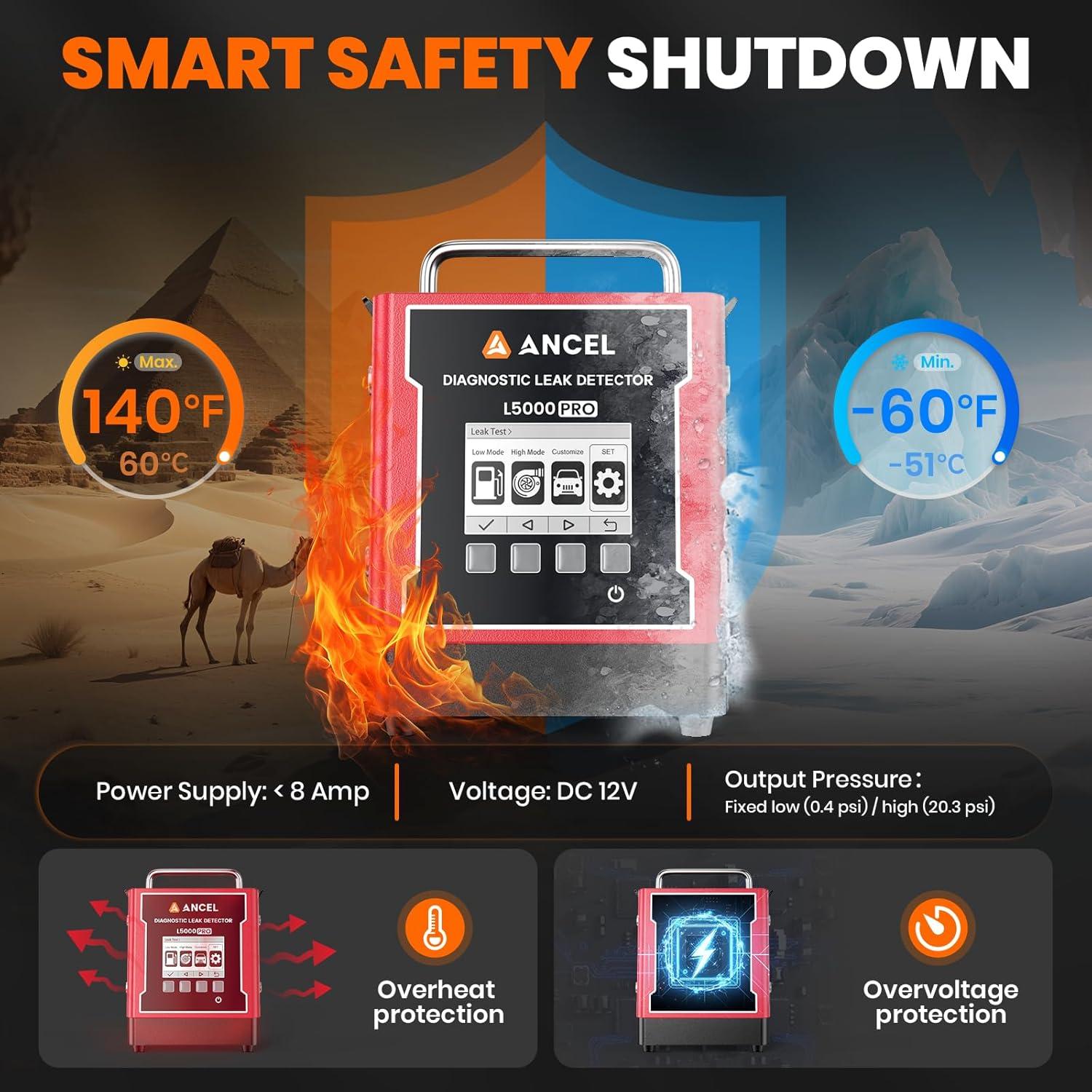 Dual Safety & Custom Pressure Limit: No mess, no risk, just peace of mind. Smoke machine leak detector's metal body handles daily wear, while clean, mess-free smoke keeps your workspace and vehicle tidy. Smart protection automatically shuts off when overheating or if your preset pressure limit is reached, ensuring every inspection stays controlled and safe.