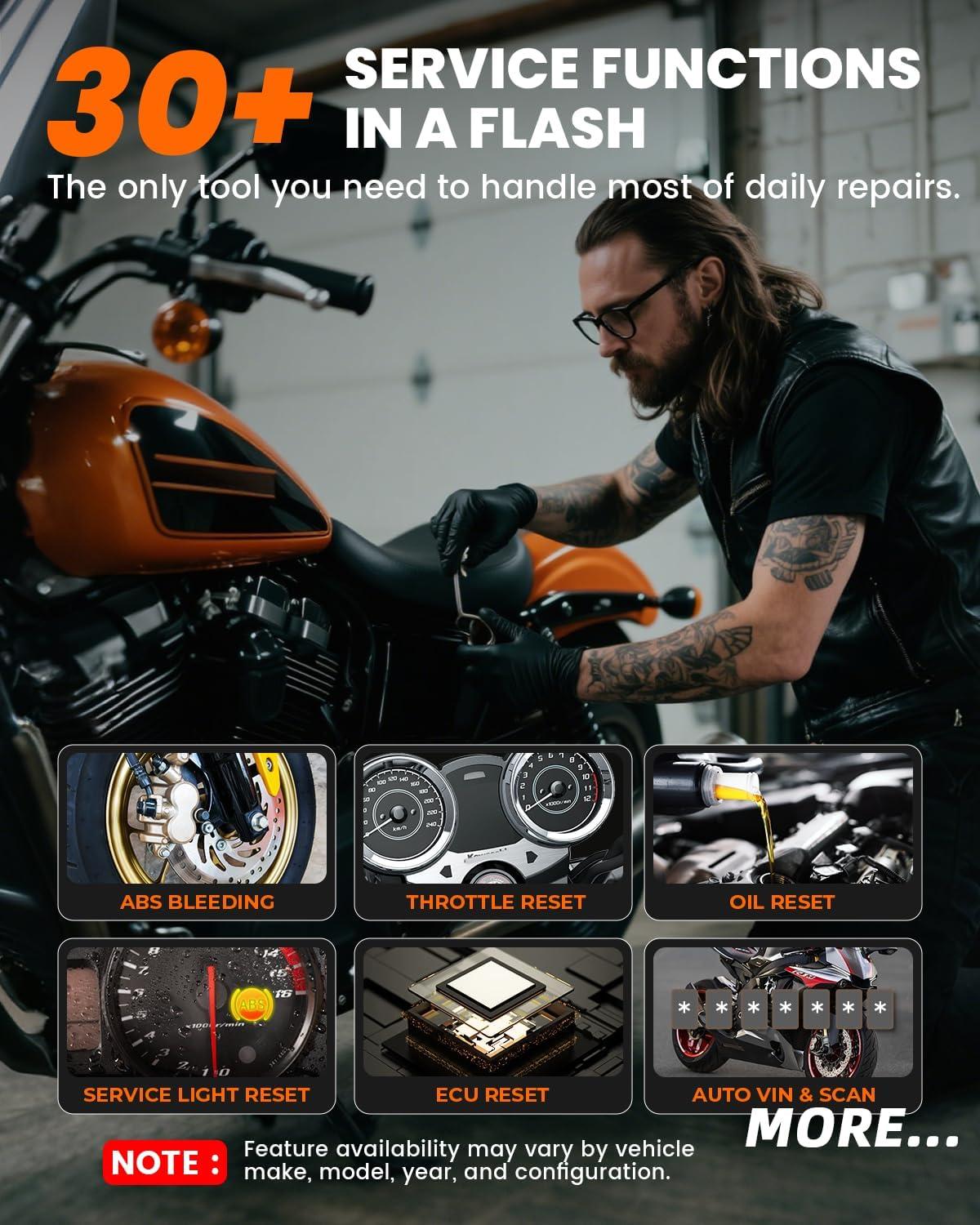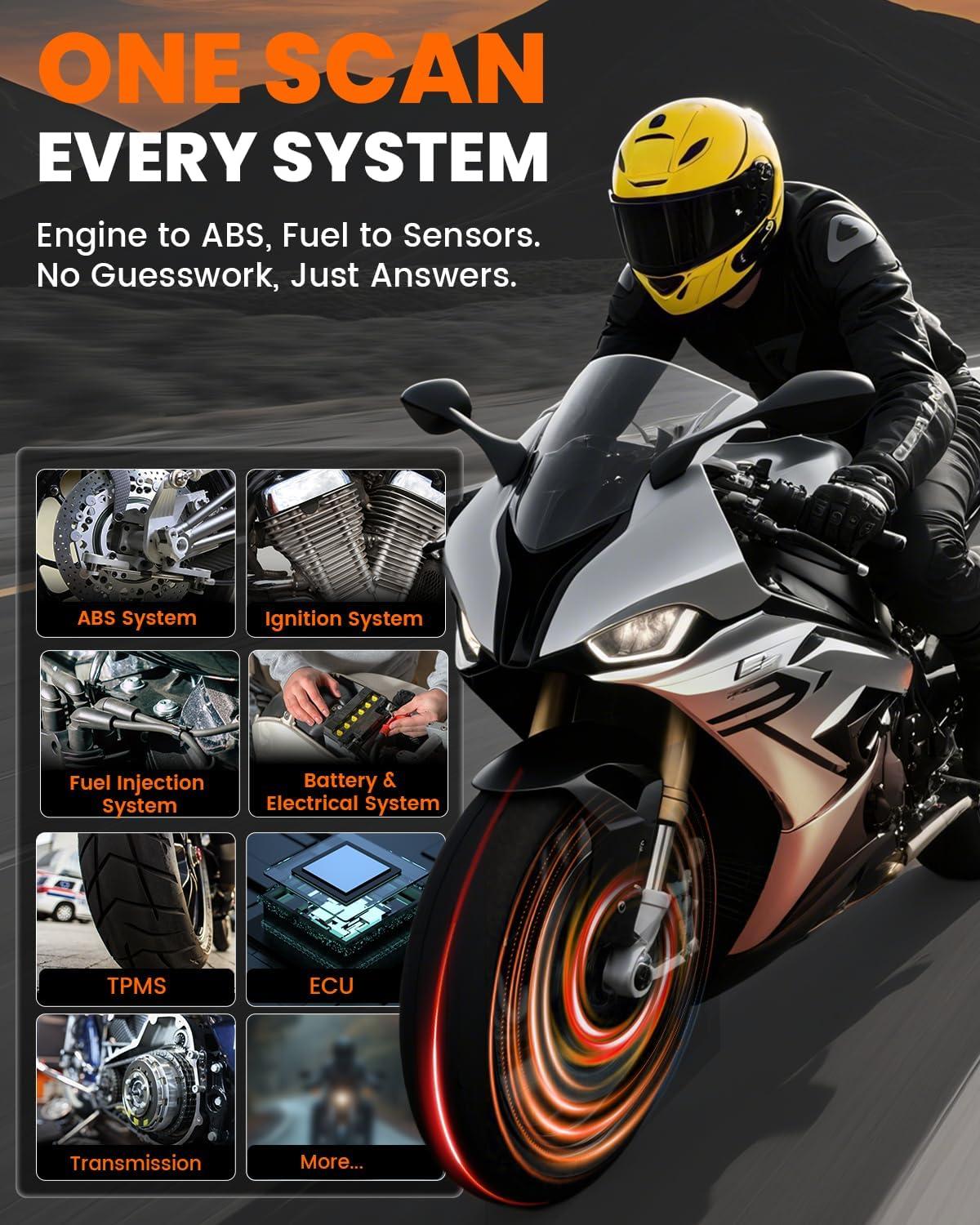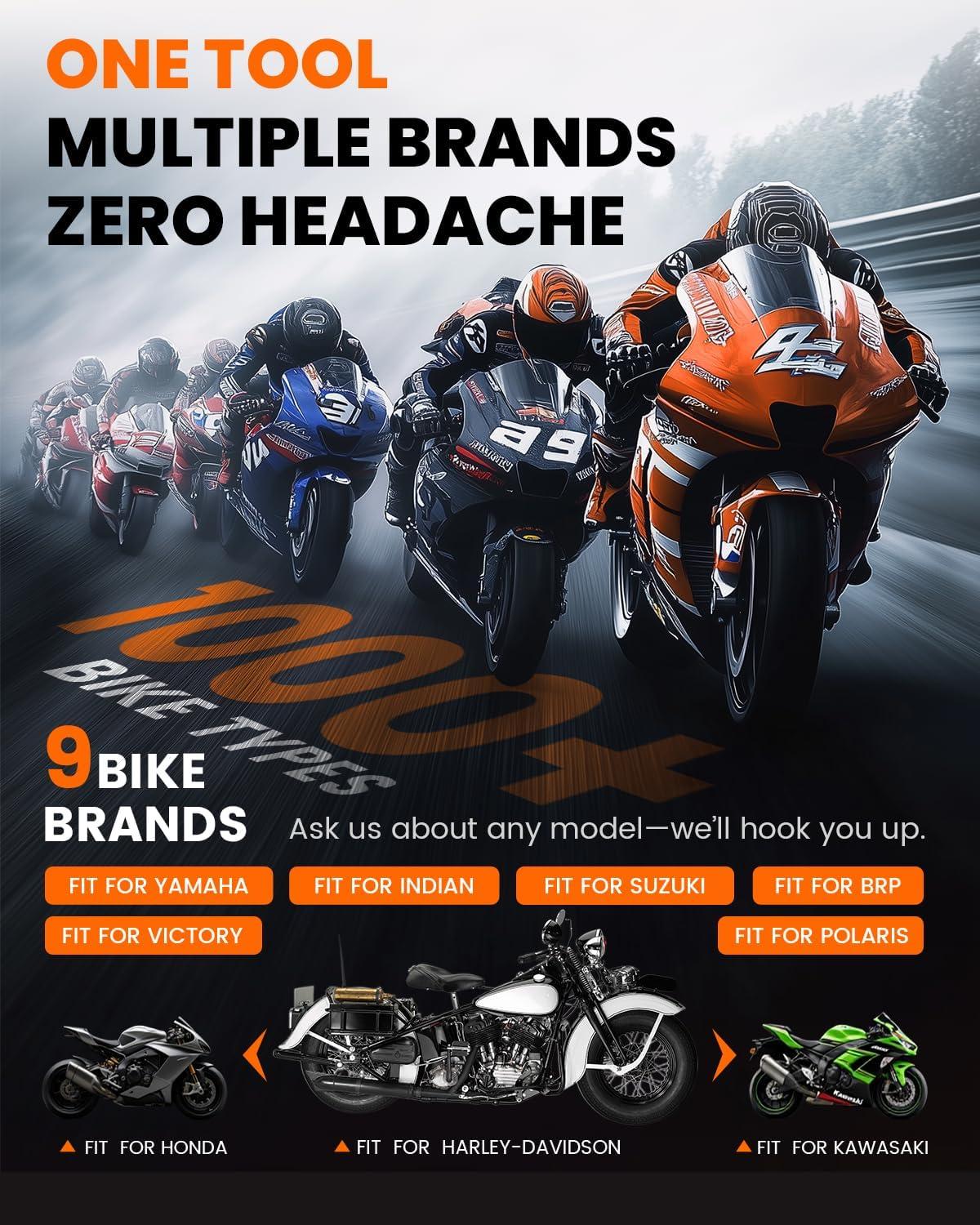 One Tool for 9 Brands, Wide Compatibility: Stop guessing which scanner works. Supports 1000+ motorcycles, ATVs, UTVs, and even Sea-Doo watercraft for Harley-Davidson, Polaris, BRP, Honda, Yamaha, Kawasaki, Suzuki, Indian, and Victory. 9 brand adapters included, no extras needed. Note: Feature availability may vary by vehicle make, model, year, and configuration. For details, please c-ontact: [email protected]