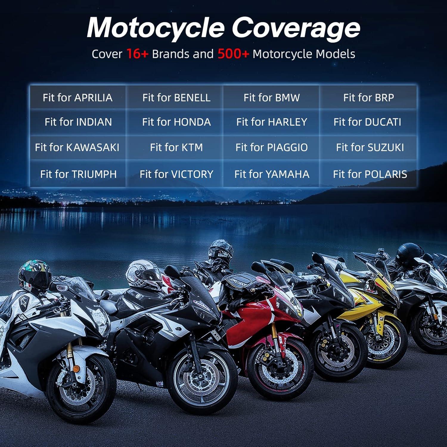 Wide Vehicle Coverage – it supports up to 16+ brands and 500+ motocycle models, brands include Aprilia, Benelli, MMW, BRP, Ducati, Harley, Honda, Indian, Kawasaki, KTM, Piaggio, Suzuki, Triumph, Victory, Yamaha and POLARIS.covering a wide types of motorcycles popular around the world, such as scooters, side-by-side motorcycles, snowmobiles, ATVs and more.