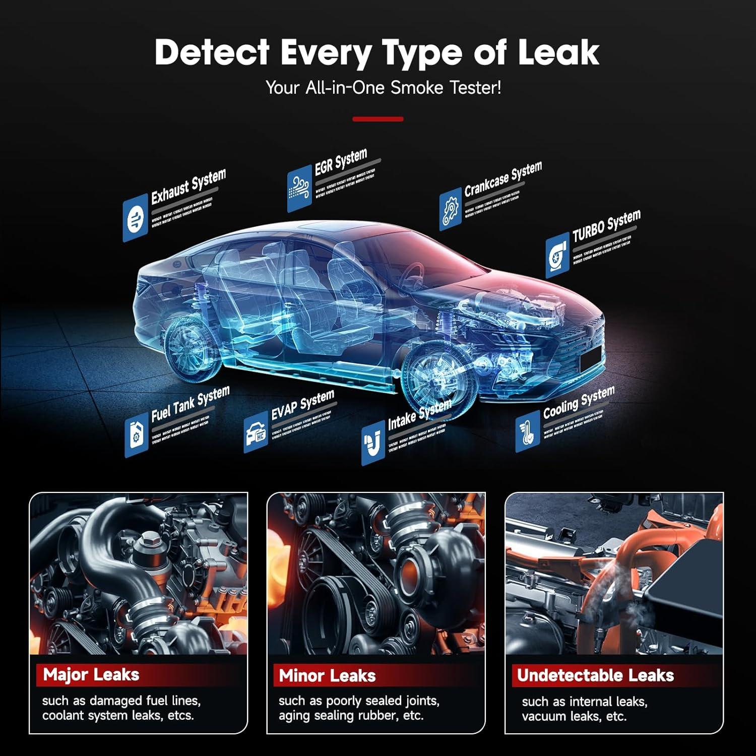 SIMPLE & PORTABLE: Begin leak detection in just 4 simple steps with this user-friendly automotive smoke tester. Lightweight, portable, and equipped with a built-in air pump, it's perfect for on-the-go jobs, empowering you to detect leaks effortlessly
