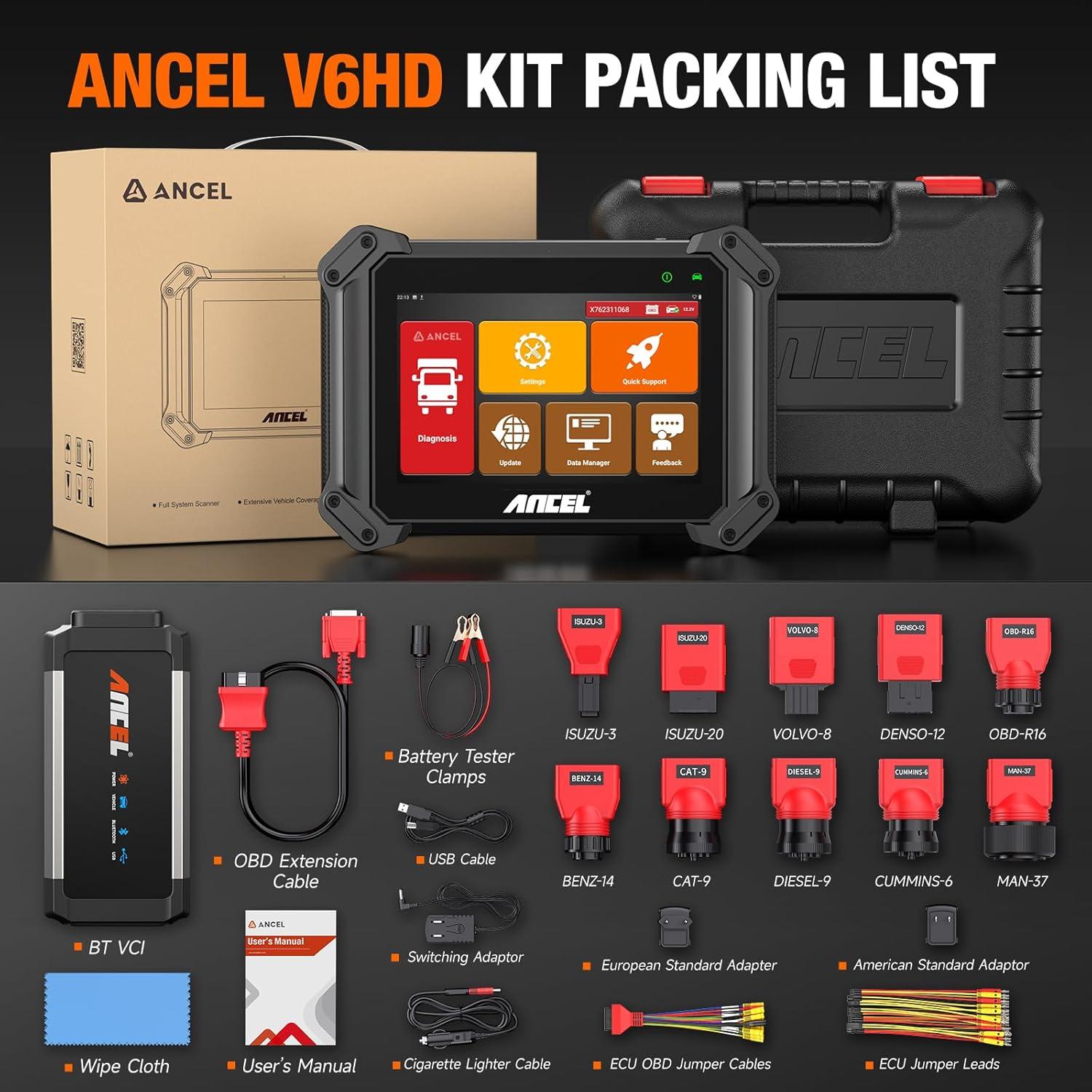 ANCEL V6HD Heavy Duty Truck Scanner, 2024 Diesel Diagnostic Scan Tool with Wide U.S Diesel Truck Compatibility, 40+ Resets, ECU Coding, Free Update, DPF Regen for Cummins, Caterpillar, Paccar, Detroit