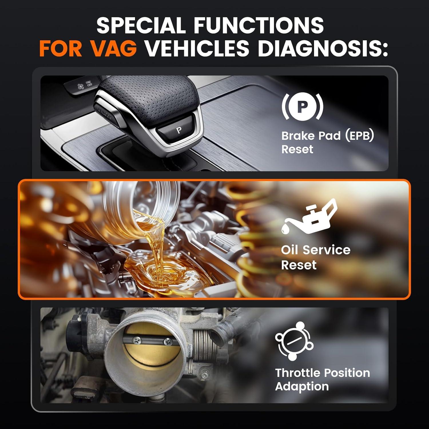【Basic + Special Advanced Functions for VAG Vehicle】The ANCEL VD500 scan tool for vw can not only read and clear codes on engine, ABS, transmission, SAS (Only available for VAG vehicles via the 'V/A Diagnostics' menu.), ESP, TPMS and other systems, but also reset the oil, brake pad(epb service) and throttle position adaption. If you don't know how to do it, please con-tact us in time. Include your car model, year and the function you want to do