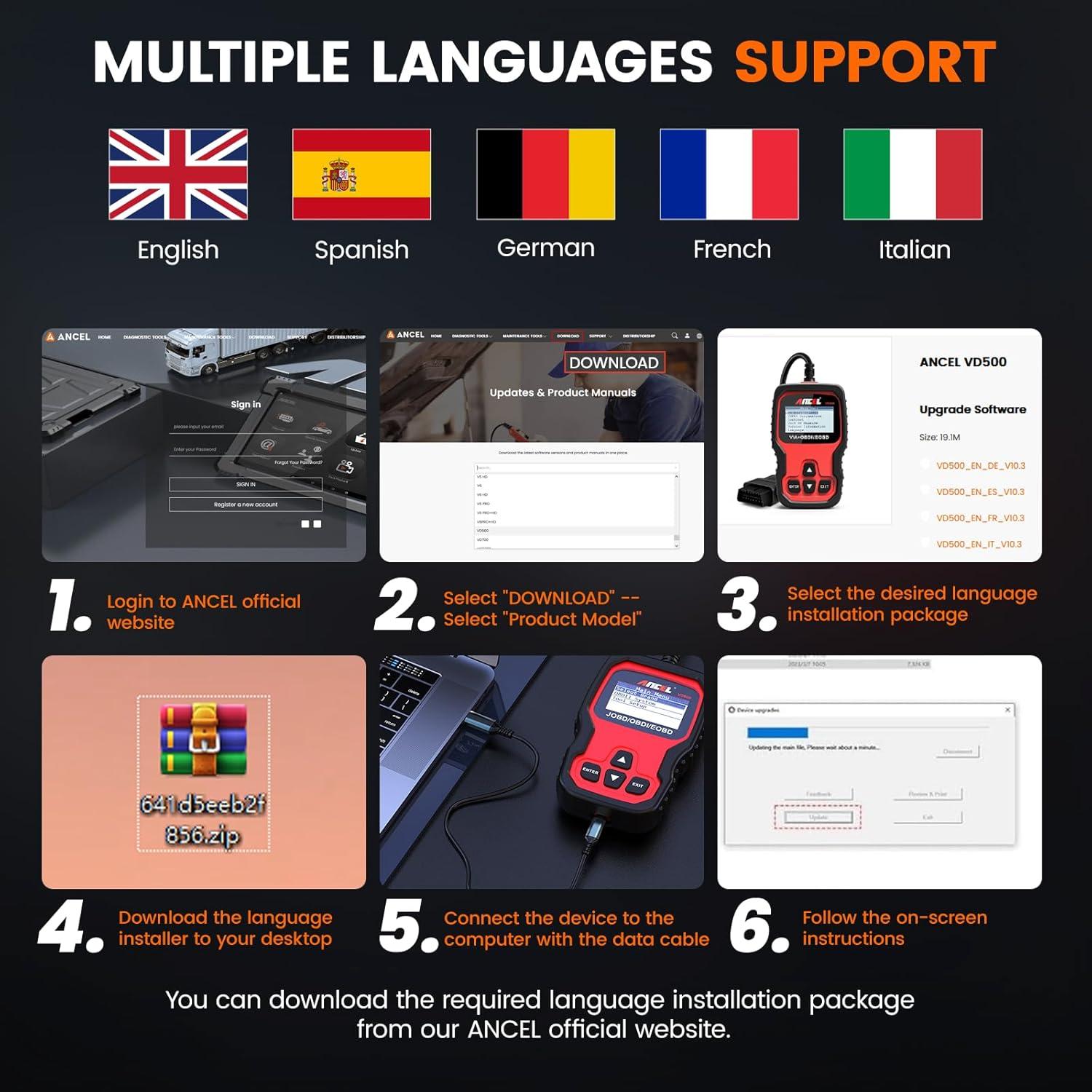 【Multiple Language Options】This diagnostic scan tool comes with English and German as default languages. You can also download Spanish, French, and Italian from the official website, based on your preferences. Plus, you can update the software through the website to fix errors or add new features. Just visit ANCEL's official site, download the software, and follow the easy installation instructions
